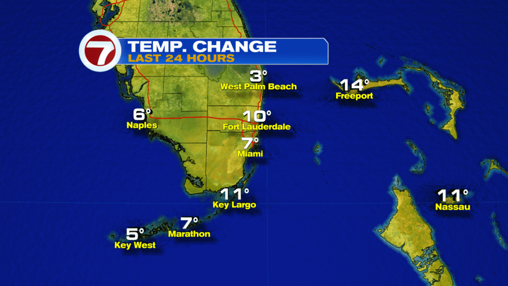 Hopefully everyone had a great weekend! South Florida enjoyed comfortable temperatures the last few days as highs for many remained in the upper 70s both Saturday and Sunday. Plenty of sunshine to start the weekend and cool temperatures in the 50s, for some, gave way to building clouds on Sunday and more of a breeze by the afternoon hours. This morning, South Florida experienced gusty winds at times but overall temperatures were milder than they had been in previous days as most of us remained in the 70s overnight.  Only 1 or 2 South Florida spots managed to reach the upper 60s. So if it felt warmer outside this morning, that’s because it was! Temperatures were running up to 11° warmer this morning compared to Sunday’s morning’s temperatures. The cooldown from late last week that lingered into the upcoming weekend has now gone and changes are officially underway.